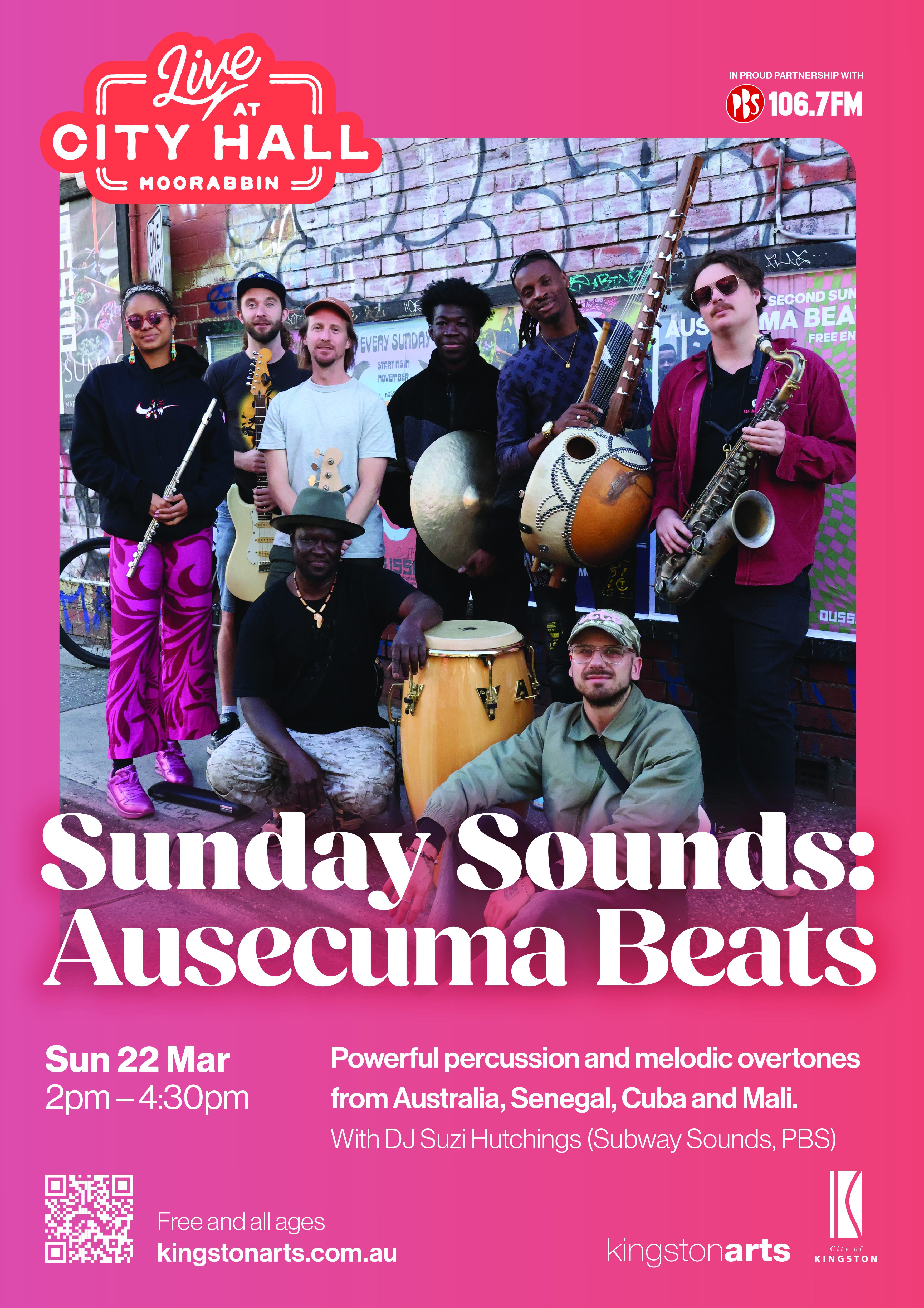 Sunday Sounds returns on Sunday March 22 with an afternoon of powerful rhythm, community and connection at Kingston City Hall, featuring a live performance from Ausecuma Beats and DJ sets from Subway Sounds' Suzi Hutchings.